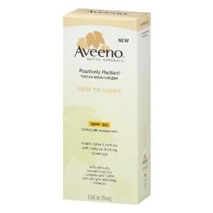 Aveeno positively radiant daily Moisturizer SPF 30, light tint-(2.5 oz.). I ran to neutrogena SPF that I used for years, and recently made me look Pasty, caky with flakes of skin ... I stopped using spf all together, but I really didn't want to do without much longer so browsed amazon for a good alternative and read about by aveeno ultra-calming spf I use many products aveeno so I decided to give it a try ... well while waiting for the slow amazon expeditionI went through a store on the way home and bought this article, I really did not expect much from it because I've never had good experience with moisturisers spf 30 colorful but it was and I was sold on this just to tie me over until something to calm my Red spotted tottering down winter dry skin ... When the shower in the morning and slathered on like I usually do with SPF so moisture shower would soften somewhat its consistency and continued to dry my hair, have breakfast, watch the news etc well when I came back to do my makeup really surprised me-I don't need concealer or Foundation ... I put on the glasses because everything looks better when one is blind, but I had really great coverage, even ... luminescence I don't know how much longer I'll keep being in love with this product ... I bought another pipe to carry in my bag, in case there is no longevity in it, I have not tried to be on call, but certainly held up well for a good 9 hours ... so, I am very pleased ... I hope not to change the formula or high price ...